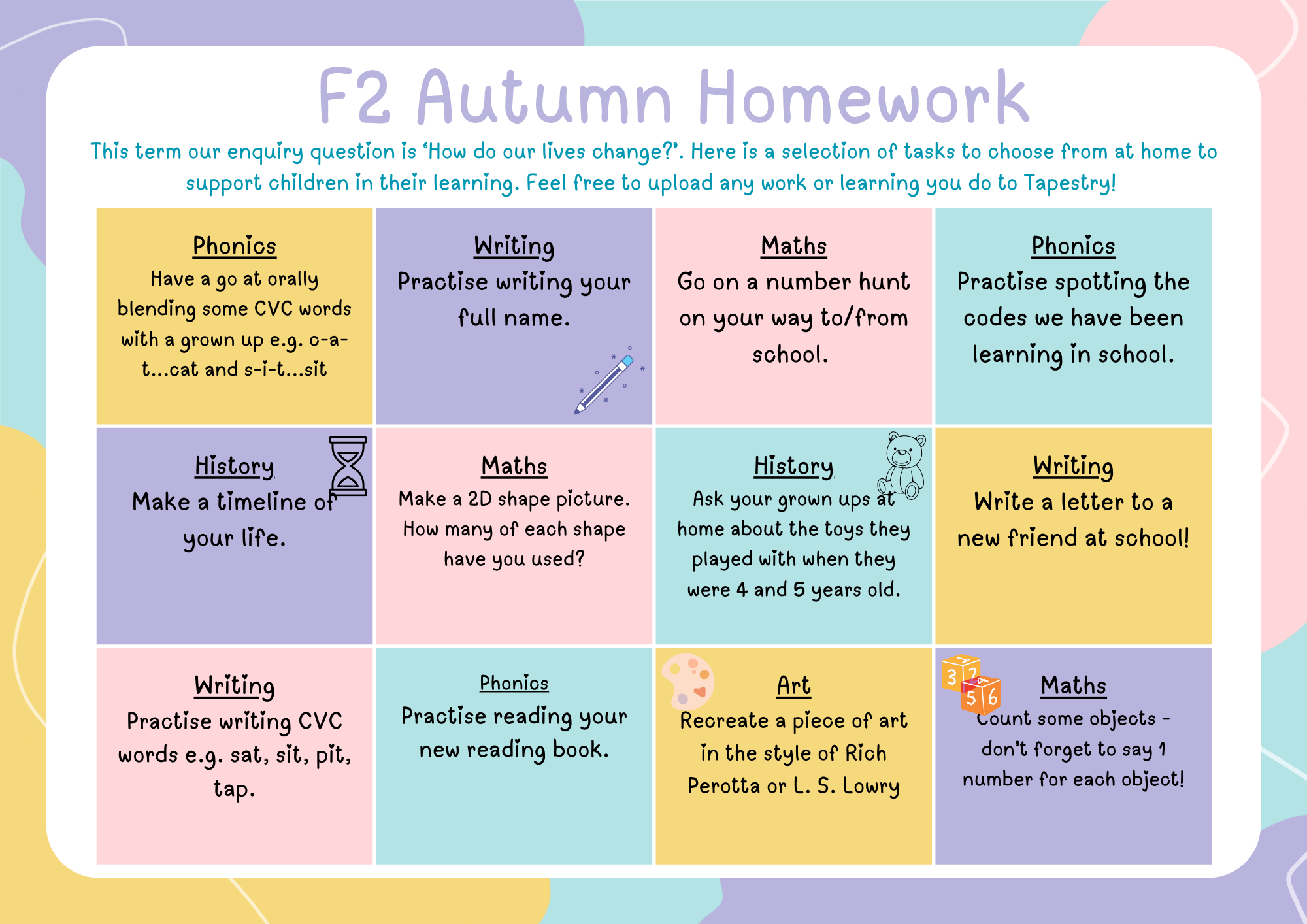 Here is our Autumn homework menu. Feel free to upload photos of your homework on Tapestry!